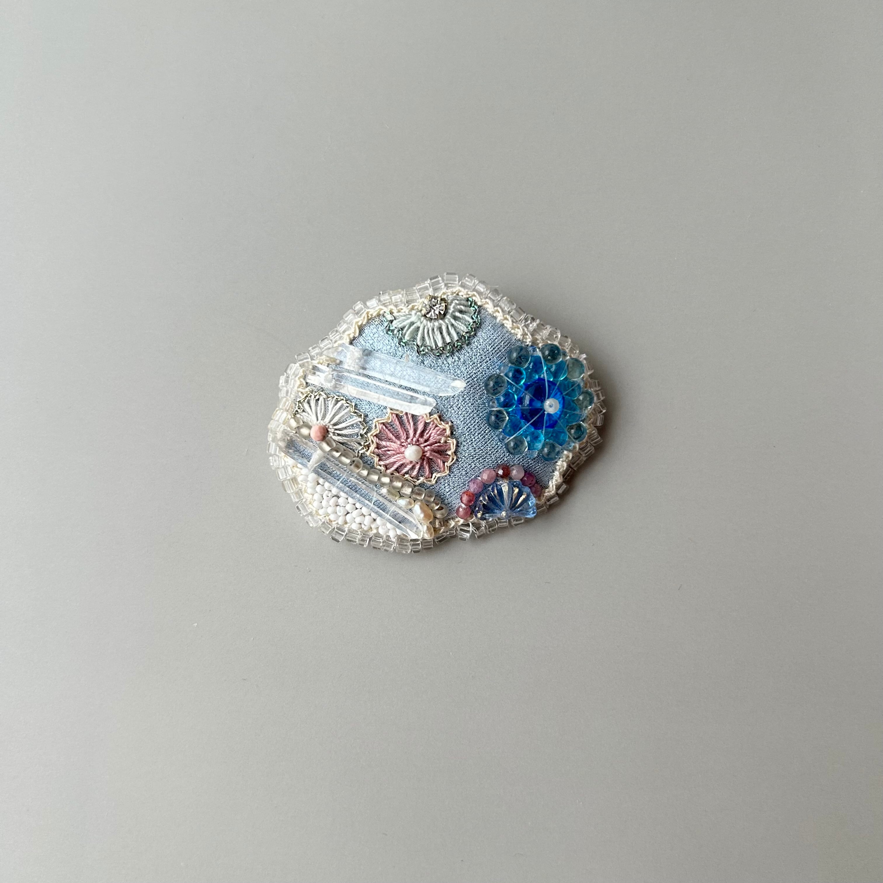 放射線状に広がるいくつかのお花のような模様は、糸のみで刺繍し中心に淡水パールや石をあしらいました。