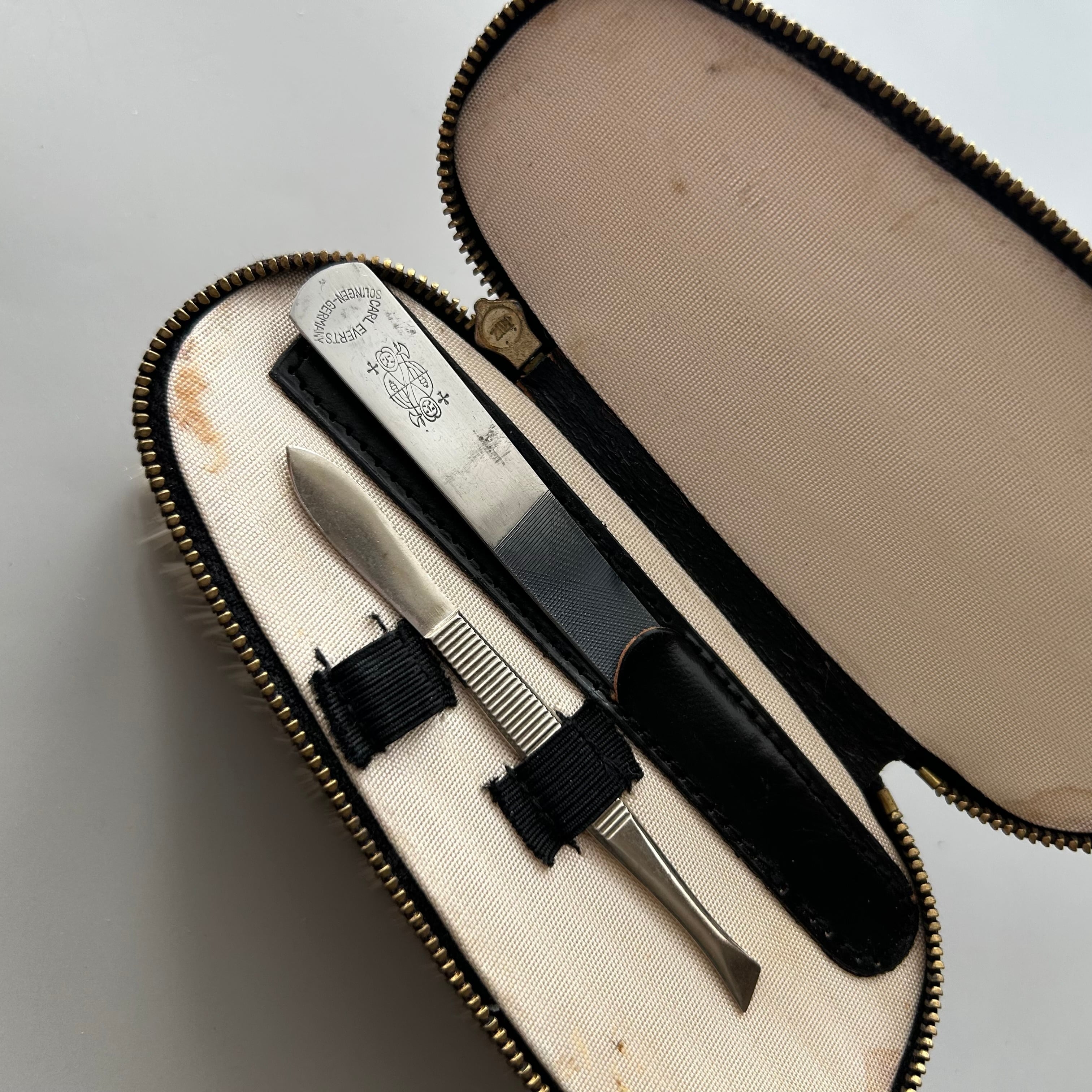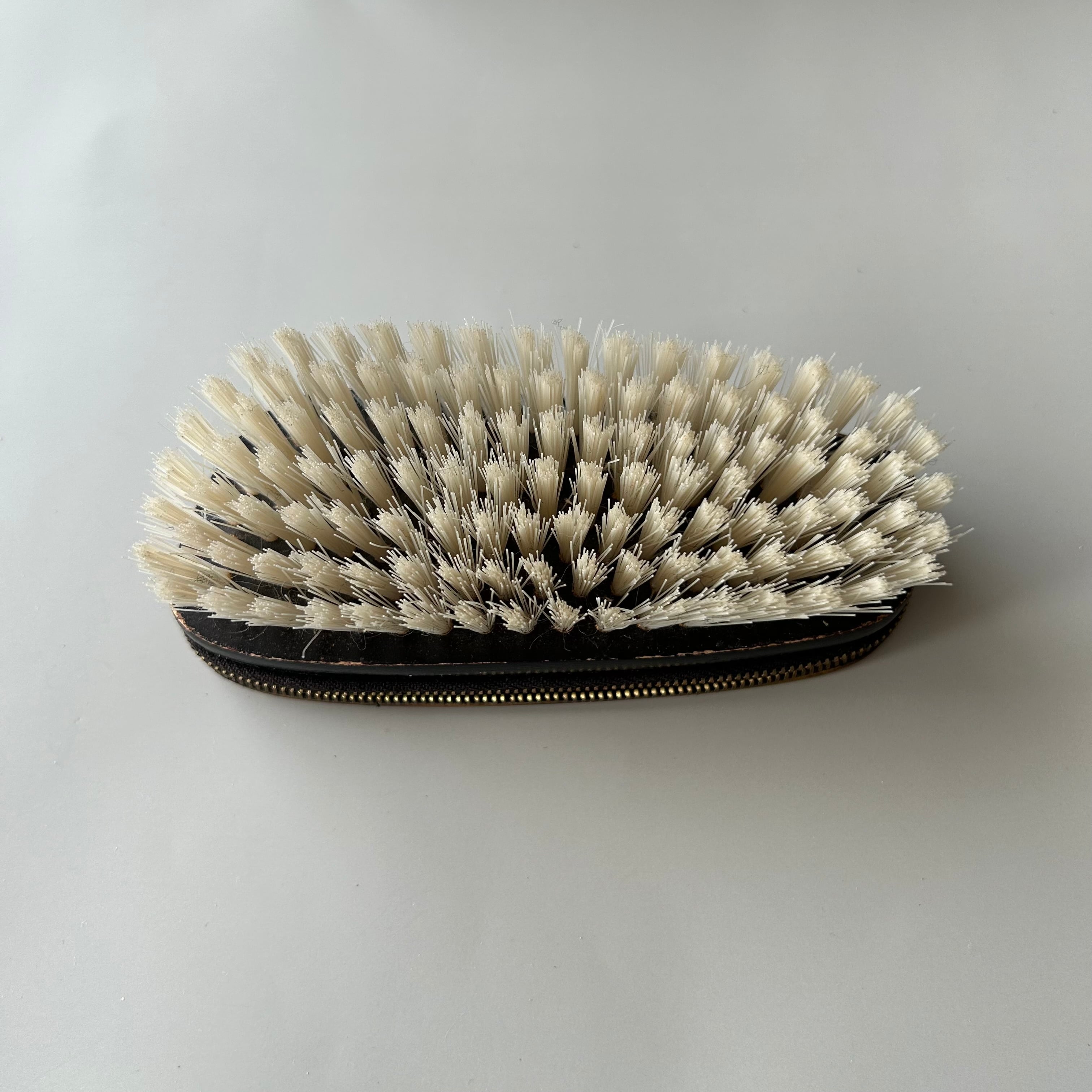 スイスのヴィンテージエチケットブラシの上部が、ファスナー付きの入れ物になっています。中には、ネイル磨きのヤスリ、甘皮とり用の器具が入っています。
